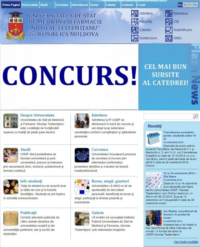 ConcursPentru că doar împreună putem dezvolta portalul informațional universitar www.usmf.md, astfel încât să fie cât mai util și mai atractiv pentru vizitatori, am decis să lansăm o provocare pentru toate catedrele de la USMF ”Nicolae Testemițanu”. În perioada 15 octombrie-15 decembrie, Serviciul comunicare și relații publice desfășoară concursul Cel mai bun subsite al catedrei, competiție în care se înscriu, în mod automat, toate subdiviziunile didactice ale Universității.